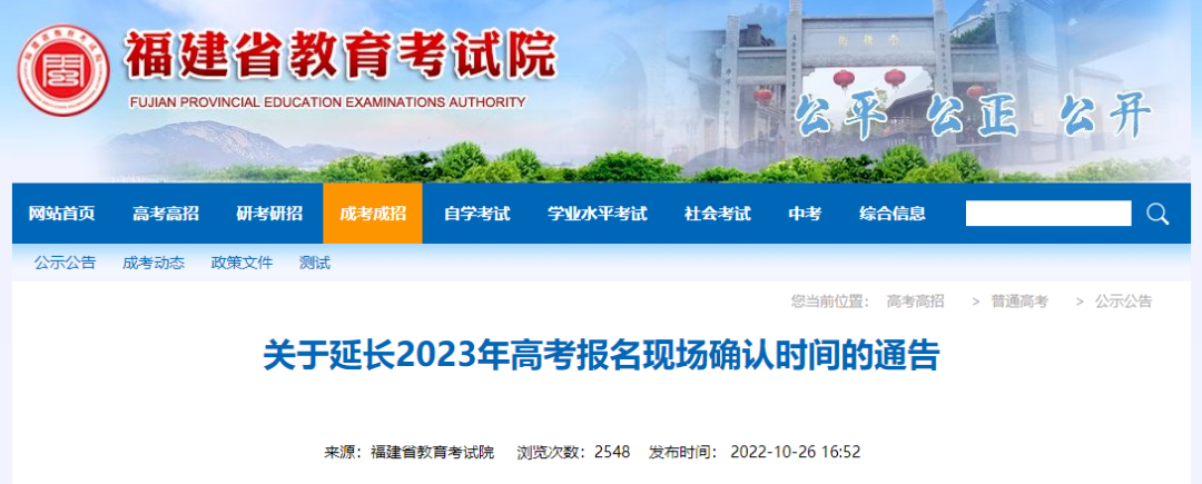 福建省考试院最新通知:根据目前我省疫情形势,经研究,决定将2023年我省高考报名现场确认截止日期由10月29日延长至11月6日。