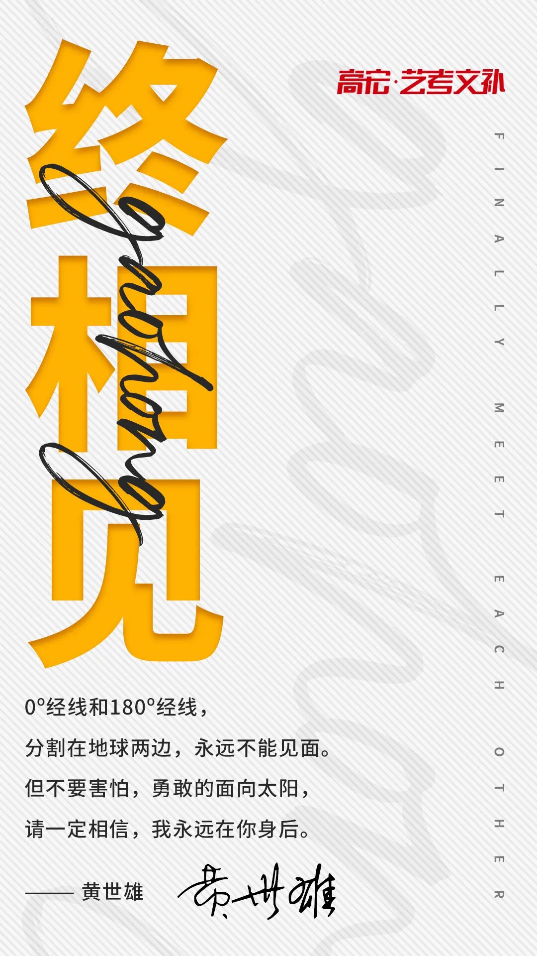 /愿联考大捷 祝高考必胜!/ 目前在上大学的同学,我希望你们学有所成在工作的同学,我希望你们工作蒸蒸日上、事业有成。 首先首先祝福他们联考大捷,其次,祝他们高考在文化课方面旗开得胜录取好学校。 ﹀ ﹀ ﹀ 0º经线和180º经线, 分割在地球两边,永远不能见面。 但不要害怕,勇敢的面向太阳, 请一定相信,我永远在你身后。 ——黄世雄 难得面对镜头的世雄老师,难掩紧张。或许那张三尺的讲台在他心里才是真正属于他自己最好的舞台。在他的舞台上,有着属于他的浪漫与执着等着你去发现。 |