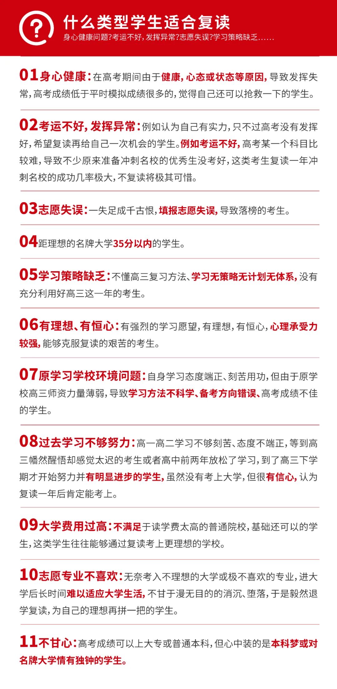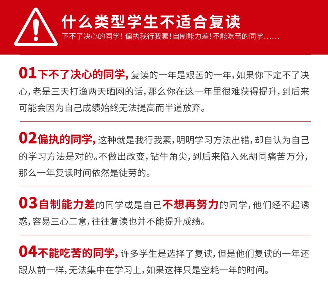 (图片来源自网络,侵权即删) 你适合复读吗? 复读是一条逆袭路,但你真的适合复读吗? 高宏教育提醒您,并非所有学生都适合复读,请务必认真按下述标准评估自己是否适合复读: