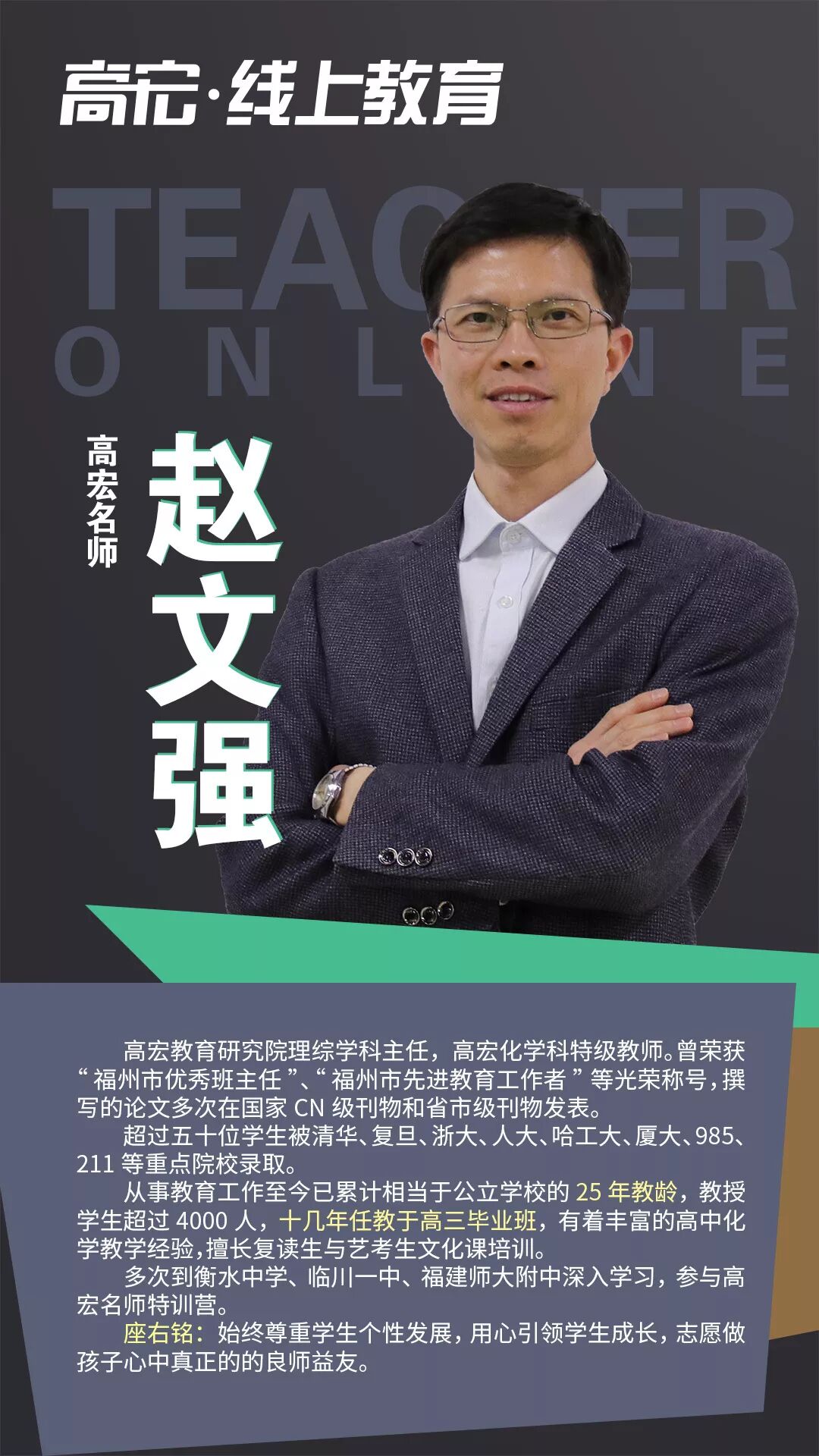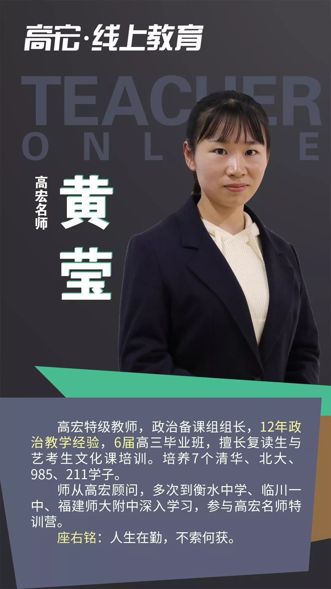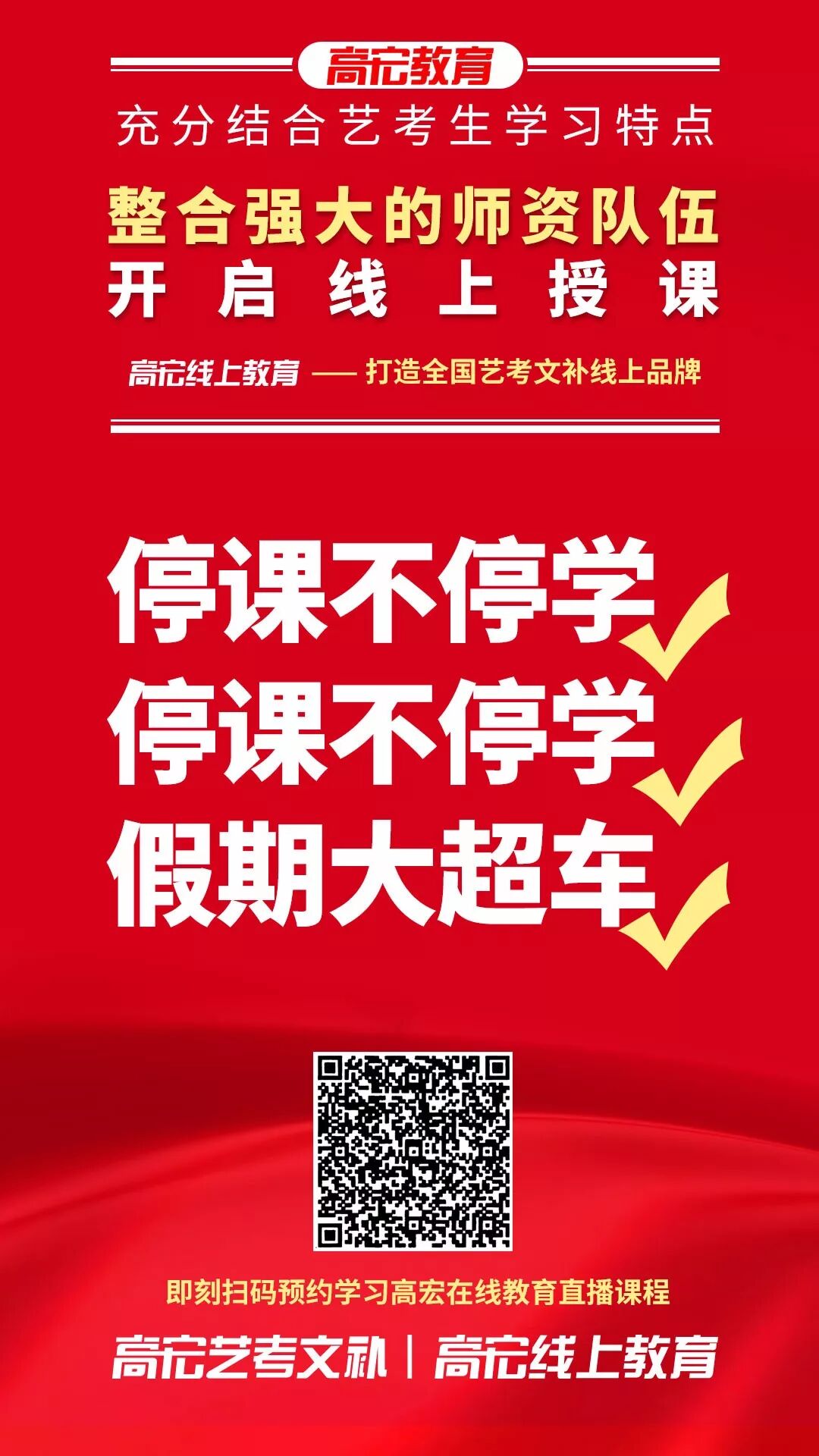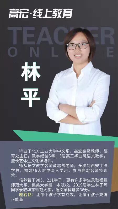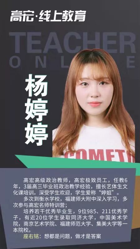 03 随时随地,在家学习 在本次疫情的情况下,注意尽量减少外出,不要去人流密集的场所。高宏线上课程,跨越时间和空间的限制,提高时间效率!在家即可保证学习进度和学习质量,不用担心停课对学习进度的影响。 04 课程直播+回放 线上课程全部采用直播模式,所有课程均可在半年内回放,让学生听懂为止。在线和面授高宏课程内容同步,进度、难度、教材教具都与面授一致。 05 限时免费上课 1月29日到1月31日限时免费上课,高宏“线上教育”打造全国优质线上艺考文补品牌。 二、高宏师资队伍介绍 高宏教育是经教育局批准成立的正规教育培训机构,始终秉承“让每个学员学有成效,让每个学员充满正能量的”的办学理念,执行“在喜悦中追求卓越”的教育思想。高宏旗下四大校区:福州大学城校区、福州高新区龙旺校区、福州高新区万达校区( 筹备)、江西南昌校区,合计面积55000多平米。先后获得福州市优质师资诚信校、福建省教育厅亲授爱心学校等;现有全职教职人员近300名,并聘请教授、原中高考命题组组长、特级教师担任我校教学顾问,办学多年,办学成效获得家长与学生的广泛认同,每年培训2000多名中高考全日制学员。 在日常教学中,教研组各科目老师坚持集体备课制度,每个科目都有十几个教师分模块研究,每周至少用两节课的时间,定时、定点、定内容、定主讲人,发挥集体智慧,深入研究教材。坚持听课制度,互相汲取营养、丰实自己,并定期在教研活动中针对常规课、拓展课及各项组内讲座、外校听课进行反馈。 线上课程名师介绍 ![]() ![]() ![]() ![]() ![]() ![]() ![]() ![]() ![]() ![]() ![]() ![]() ![]() ![]() ![]() ![]() ![]() ![]() 三、如何参与线上课程 高宏全面上线网络课程,确保学生不落下高考冲刺课程,全体班主任和科任老师每天都会隔着屏幕监督你们,我们一起为了高考冲起来!让我们一起努力,完成学业的弯道超车,赢在学业和心态上,越是艰难,越是努力。 2