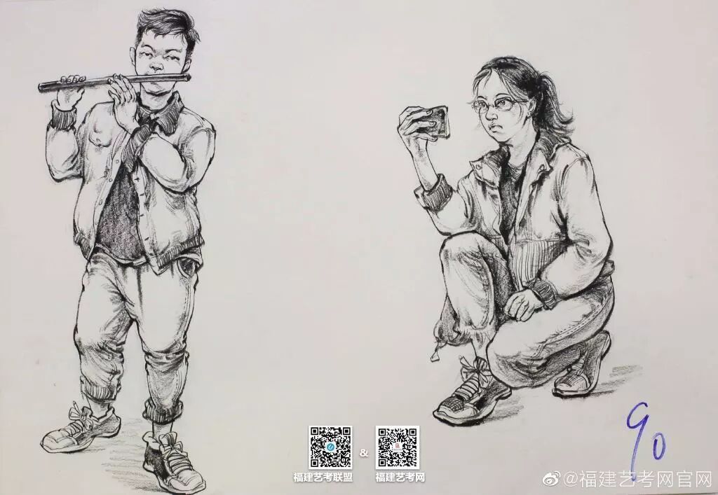 有百分之九十的考生会出现基本规律方面的失误,1.基本构图失败,2.基本比例、结构关系不恰当、3.色条混乱,黑白灰的层次混乱、4.该强调的不敢强调。 调整画面是一个必不可少的环节,许多考生往往有一个好的开始但最终交来一张不理想的卷面,往往是没有做调整画面所造成的结果。 秘籍: 1.必须留半个小时时间来检查画面,冷静观察画面。2.退到自己画后一定距离,用看待别人画作的心态、眼光、冷静仔细地挑剔自己画面。3.发现问题后,不要慌张的修改,不妨多再校对画中问题,心中思考如何调整,思考成熟后,在一气呵成迅速的调整画面。 速写技巧 ![]() 1. 是否合理构图,黑白分明。 2. 是否人物比例正确,画面生动。 3. 是否把握了人体运动规律:肩线、盆骨线,动态能抓住就等于人物有了灵魂。 4. 是否线条灵活:把握线条的对比、变化和节奏,增强画面表现力和生动性,线面结合的话更利于增强画面层次感。 建议多临摹些白描插图或者多临摹些有关速写的画册,增加对速写的认识多增加眼力,临摹多了肯定对现场考试有帮助。 色彩技巧